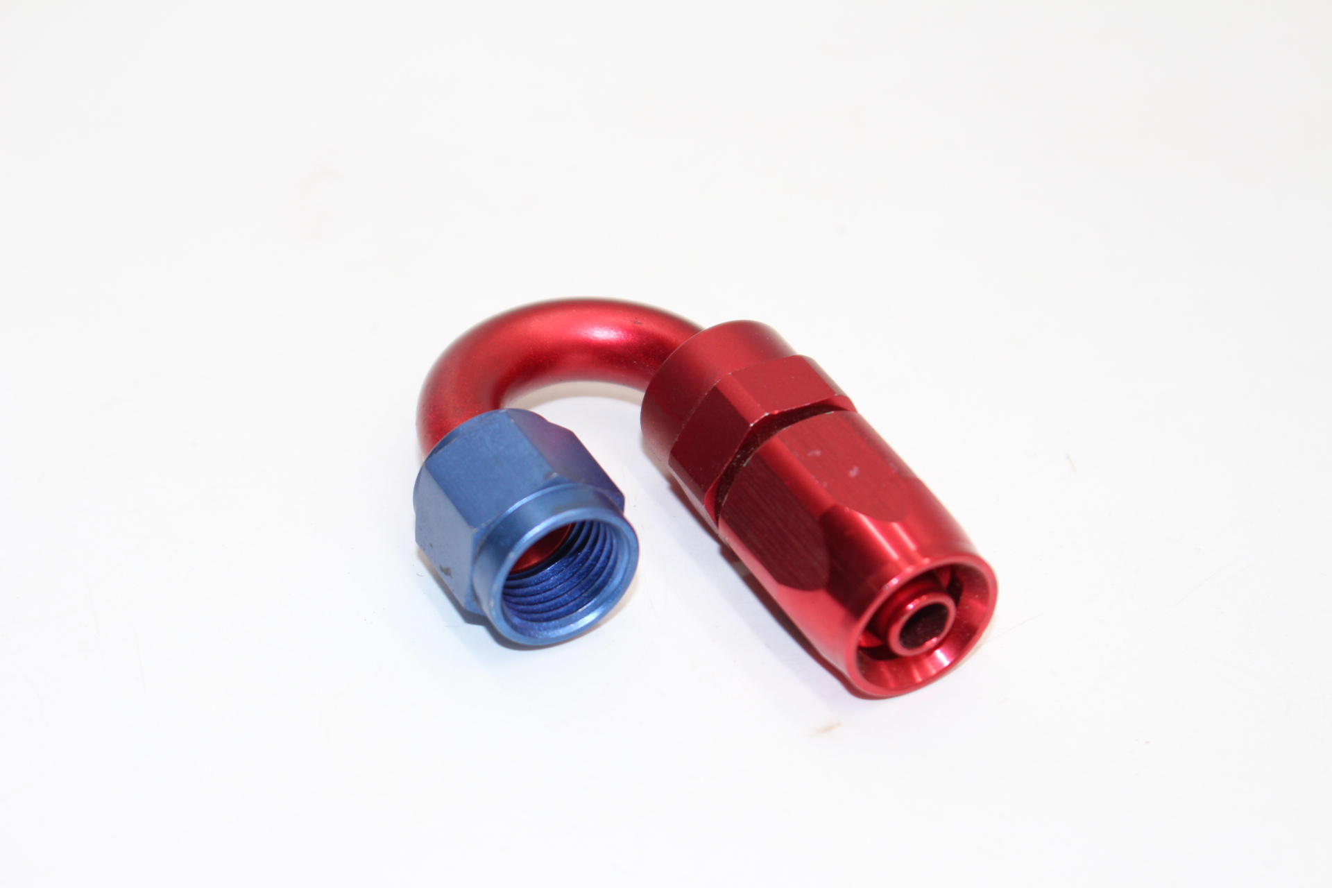 Gebrauchter ALU-Fitting 180° – Dash 6 / AN6 / JIC6 – Blau/Rot eloxiert
